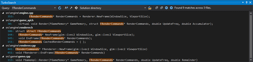 TurboSearch is a Visual Studio 2019 extension that provides a frontend for the excellent command line utility, The Silver Searcher (Ag).